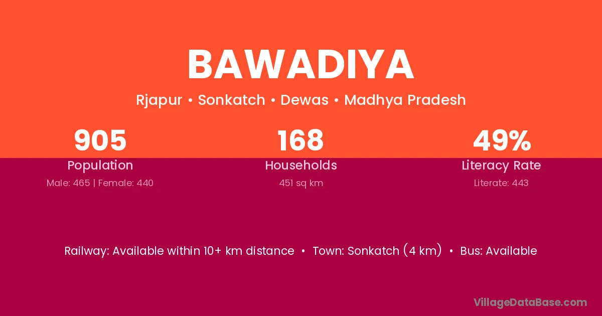 Bawadiya village has a total population of 905 people, of which 465 are males and 440 are females.