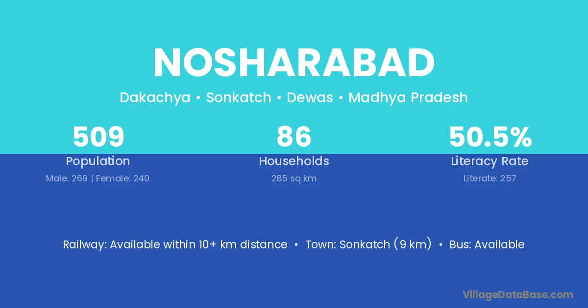 Sonkatch (9 km) is the nearest town to Nosharabad village for major economic activities and is located approximately 9 km away.