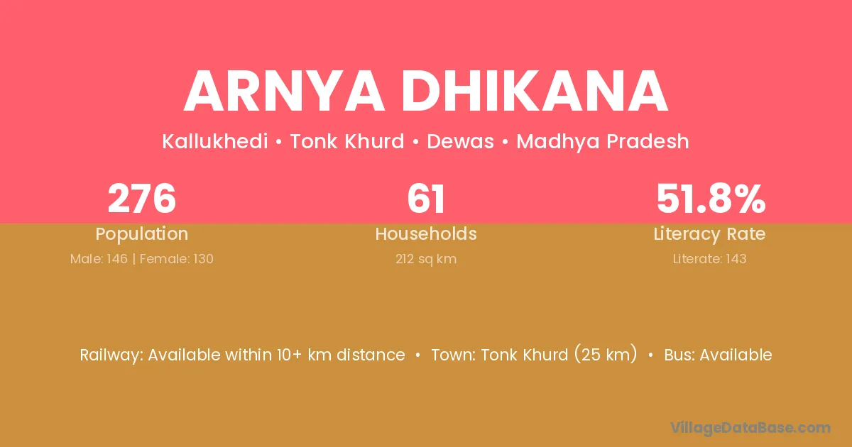 Tonk Khurd (25 km) is the nearest town to Arnya Dhikana village for major economic activities and is located approximately 25 km away.