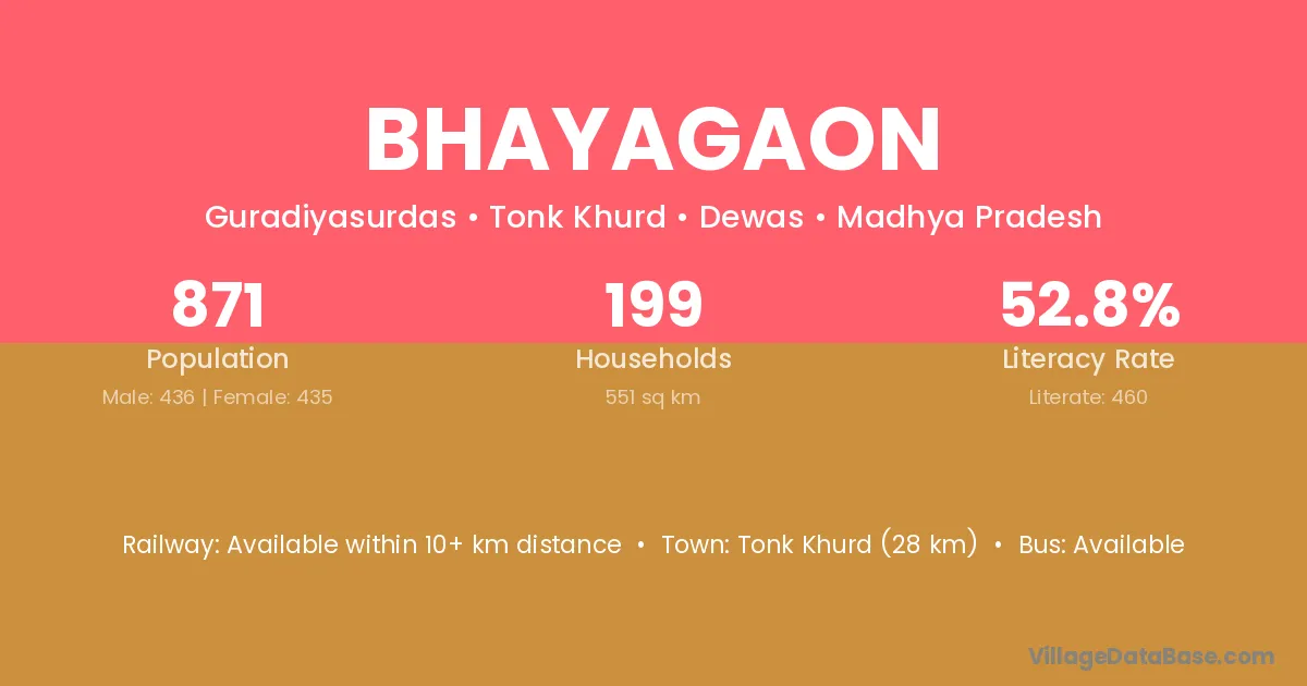 Tonk Khurd (28 km) is the nearest town to Bhayagaon village for major economic activities and is located approximately 28 km away.