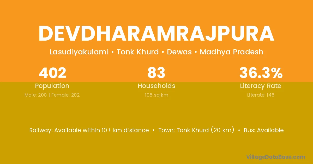 Tonk Khurd (20 km) is the nearest town to Devdharamrajpura village for major economic activities and is located approximately 20 km away.