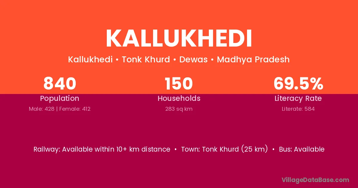 Tonk Khurd (25 km) is the nearest town to Kallukhedi village for major economic activities and is located approximately 25 km away.
