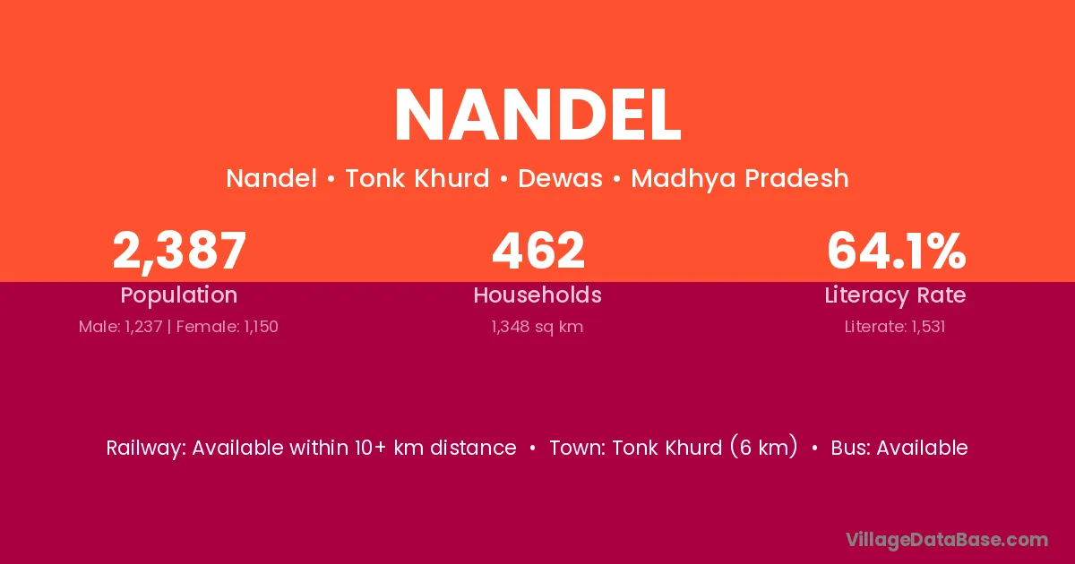 Tonk Khurd (6 km) is the nearest town to Nandel village for major economic activities and is located approximately 6 km away.