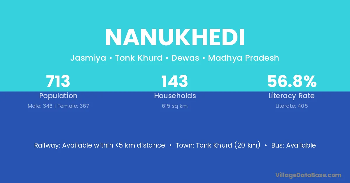 Tonk Khurd (20 km) is the nearest town to Nanukhedi village for major economic activities and is located approximately 20 km away.