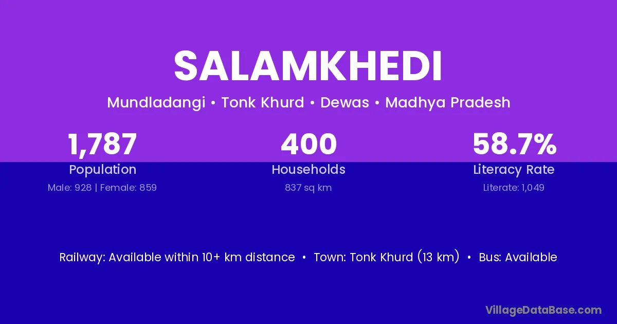 Tonk Khurd (13 km) is the nearest town to Salamkhedi village for major economic activities and is located approximately 13 km away.