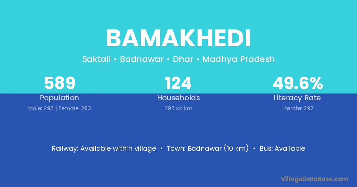 Bamakhedi village has a total population of 589 people, of which 296 are males and 293 are females.