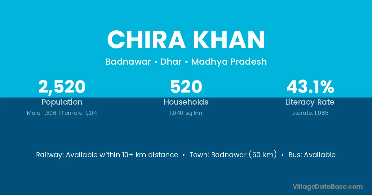 Badnawar (50 km) is the nearest town to Chira Khan village for major economic activities and is located approximately 50 km away.