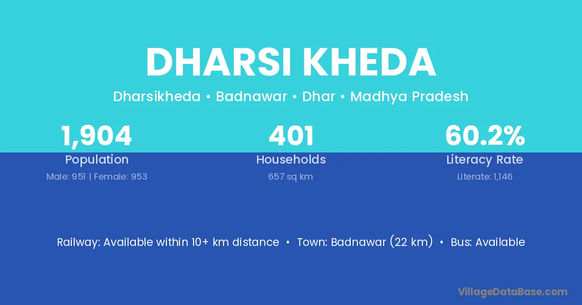 Badnawar (22 km) is the nearest town to Dharsi Kheda village for major economic activities and is located approximately 22 km away.