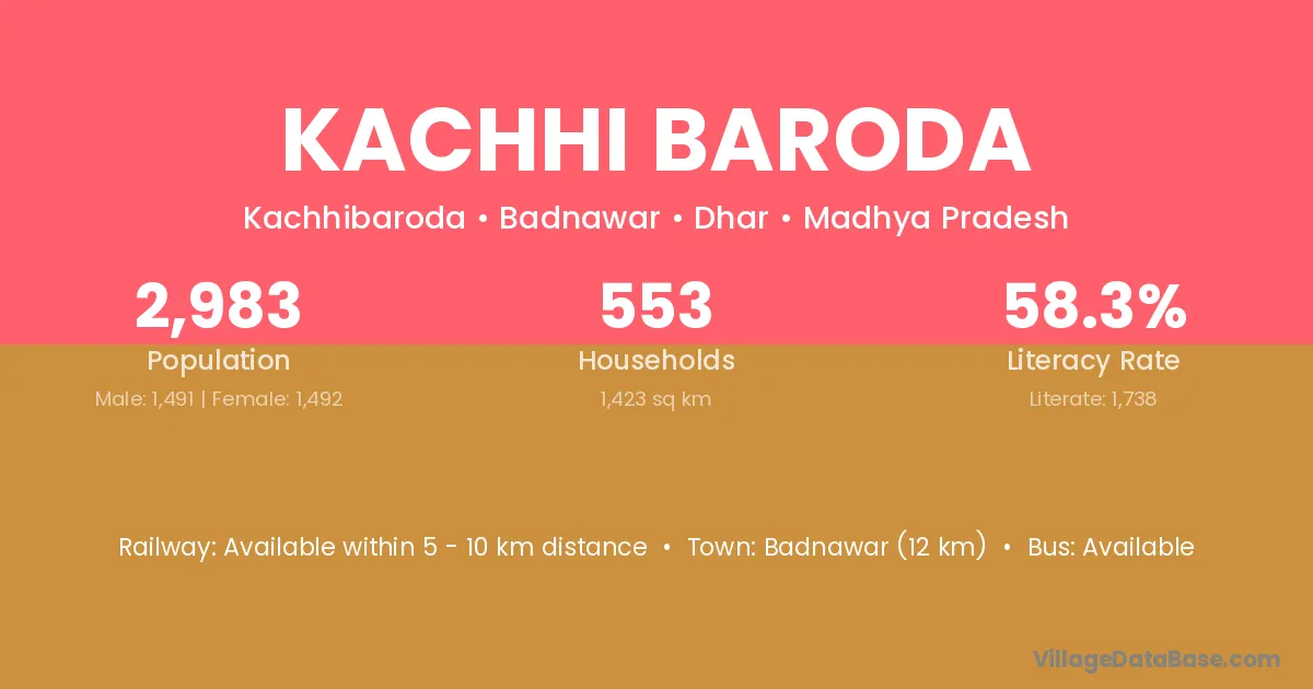Badnawar (12 km) is the nearest town to Kachhi Baroda village for major economic activities and is located approximately 12 km away.