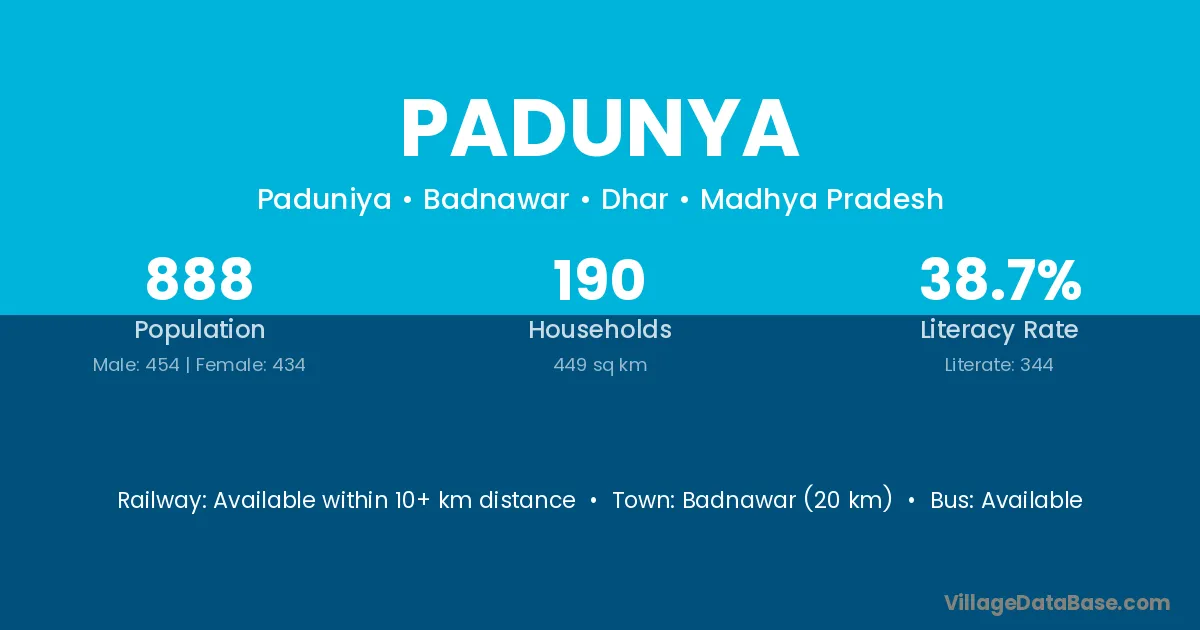 Badnawar (20 km) is the nearest town to Padunya village for major economic activities and is located approximately 20 km away.