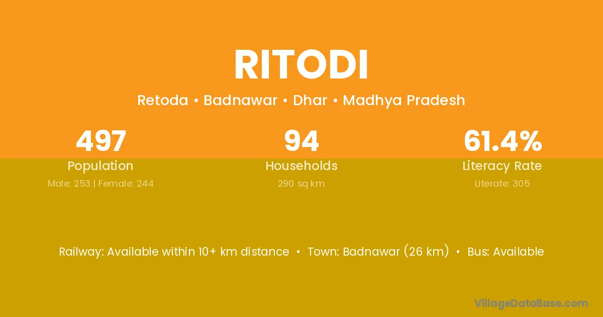 Badnawar (26 km) is the nearest town to Ritodi village for major economic activities and is located approximately 26 km away.