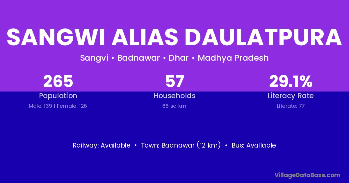 Badnawar (12 km) is the nearest town to Sangwi Alias Daulatpura village for major economic activities and is located approximately 12 km away.