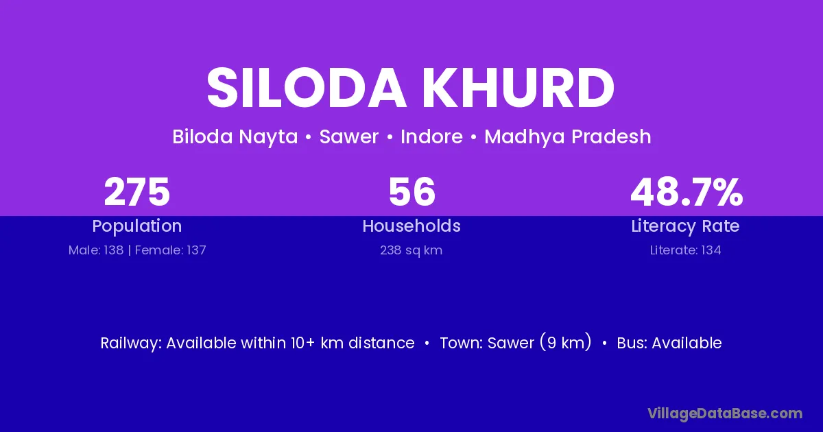 Siloda Khurd village has a total population of 1,057 people, of which 529 are males and 528 are females.