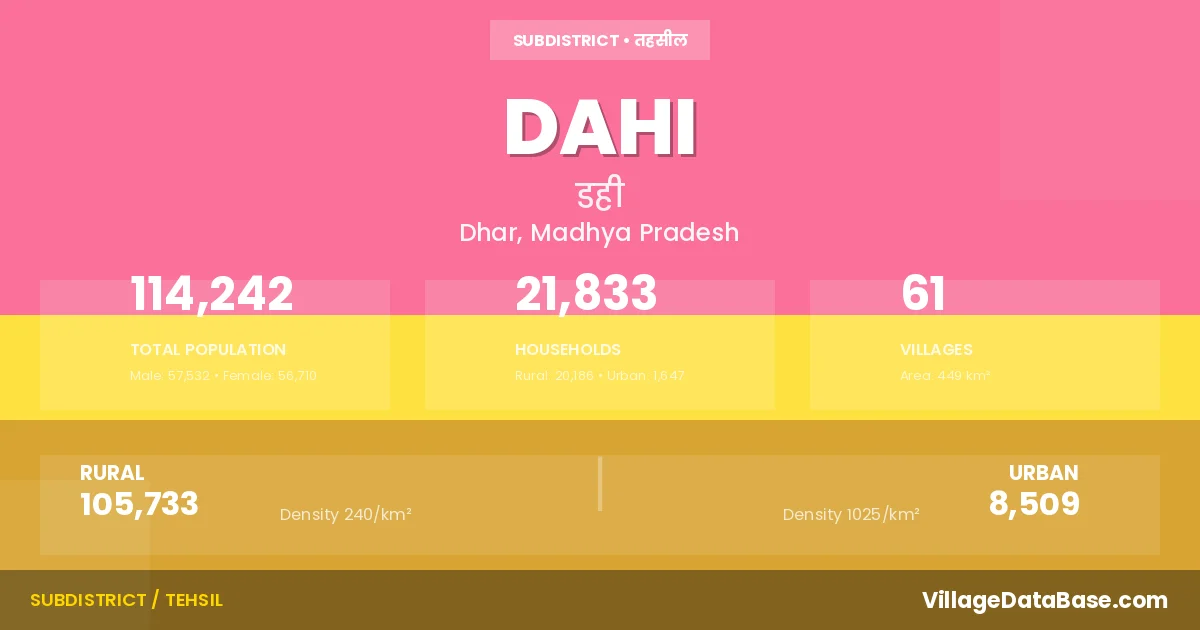 According to the 2011 census The total area of Dahi Tehsil is 449 km², with a population of 114242 people. The population density is 255 inhabitants per square kilometre, and there are approximately 21833 houses in the sub district.