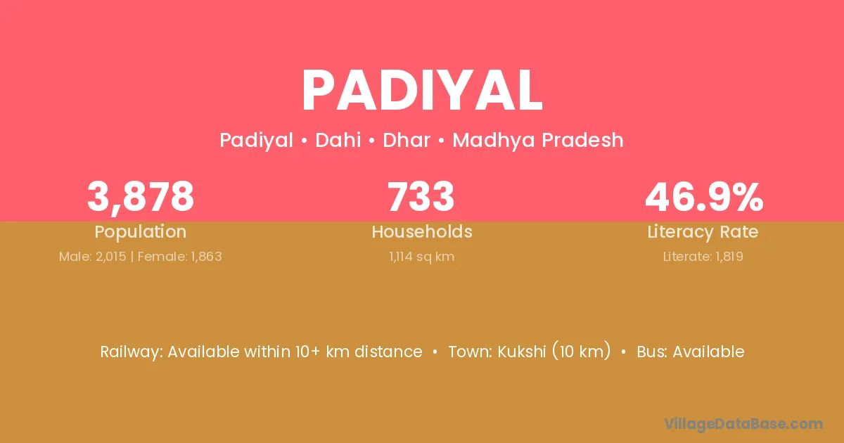 Kukshi (10 km) is the nearest town to Padiyal village for major economic activities and is located approximately 10 km away.