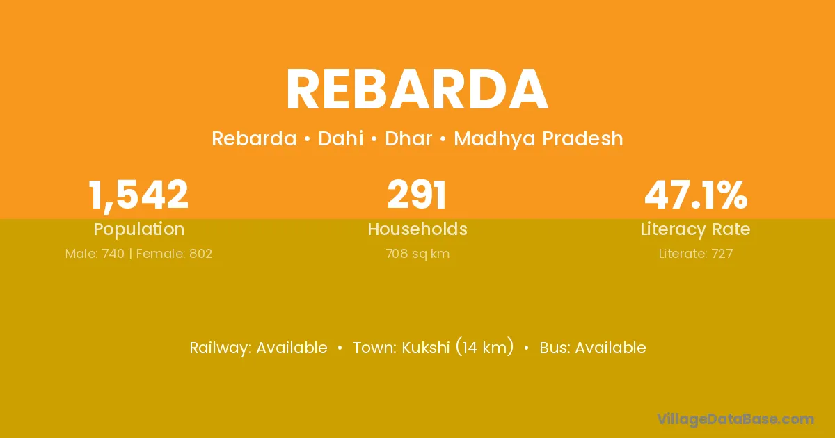 Kukshi (14 km) is the nearest town to Rebarda village for major economic activities and is located approximately 14 km away.