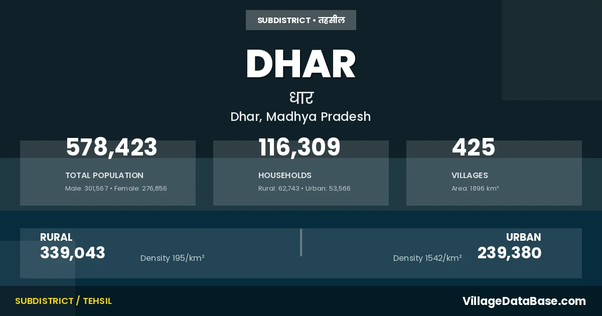 According to the 2011 census The total area of Dhar Tehsil is 1896 km², with a population of 578423 people. The population density is 305 inhabitants per square kilometre, and there are approximately 116309 houses in the sub district.