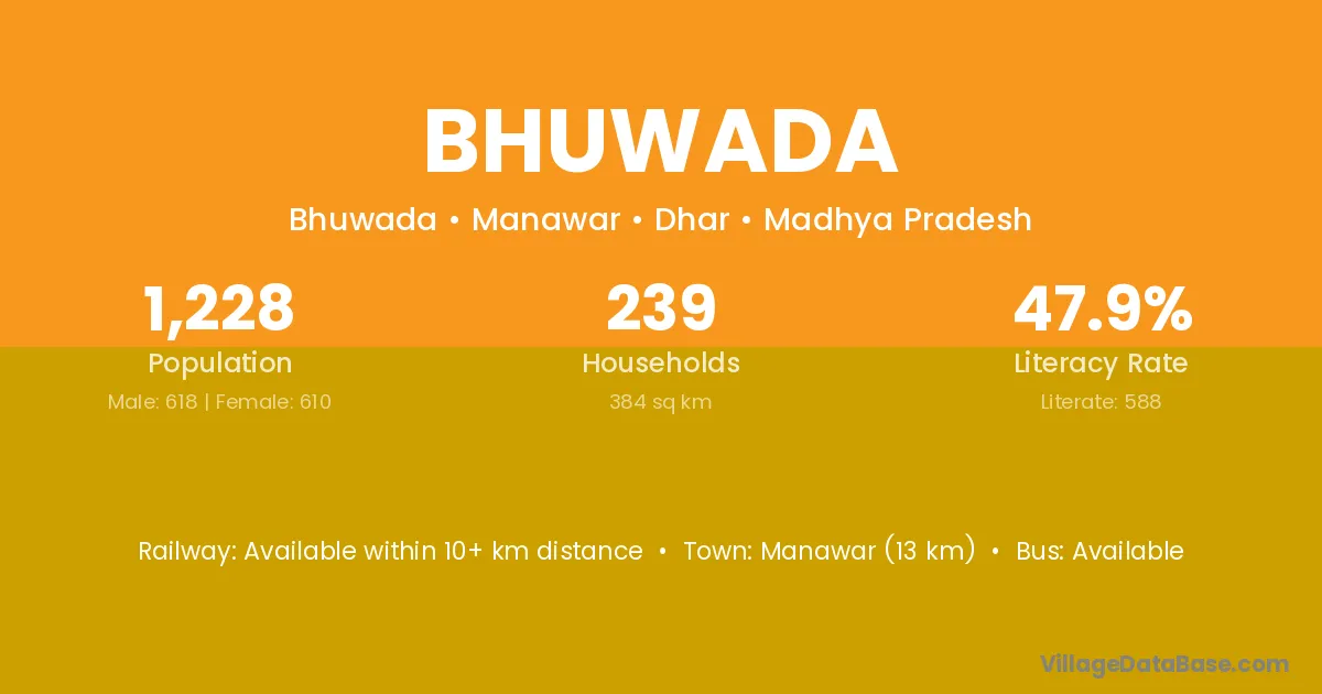 Dhar (58 km) is the nearest town to Bhuwada village for major economic activities and is located approximately 58 km away.