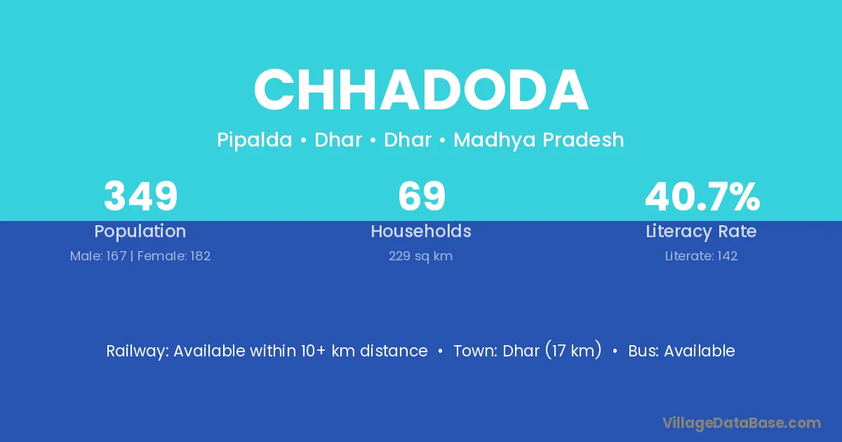 Dhar (17 km) is the nearest town to Chhadoda village for major economic activities and is located approximately 17 km away.