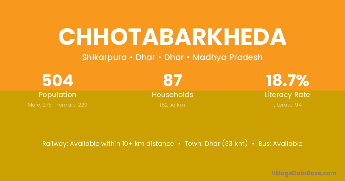 Dhar (33 km) is the nearest town to Chhotabarkheda village for major economic activities and is located approximately 33 km away.