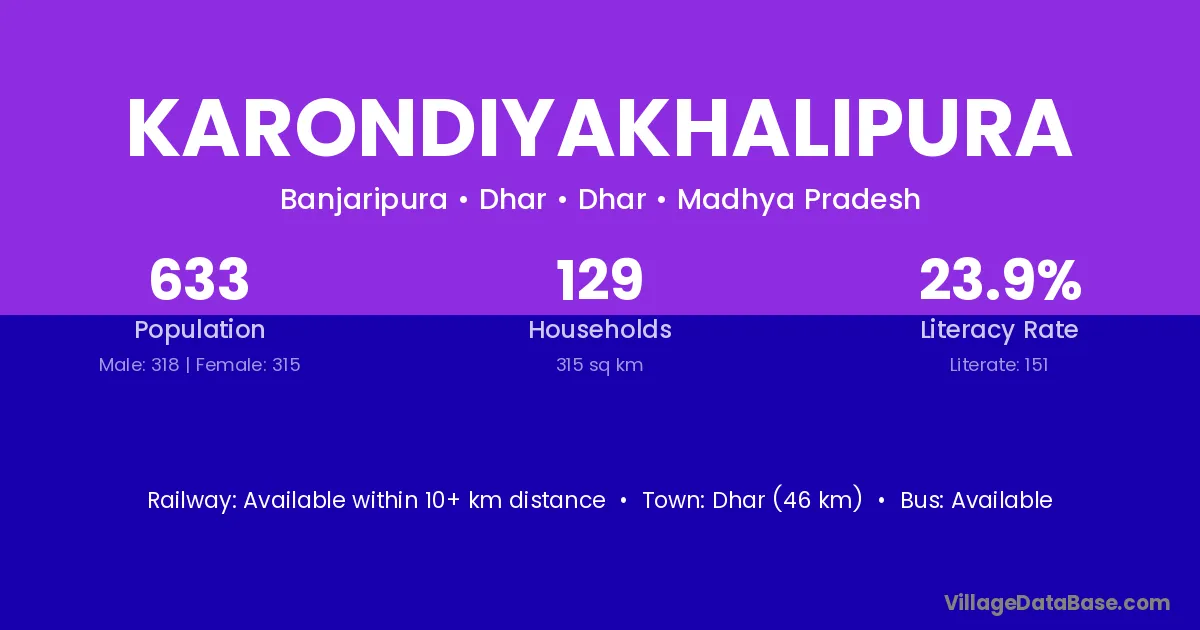 Dhar (46 km) is the nearest town to Karondiyakhalipura village for major economic activities and is located approximately 46 km away.