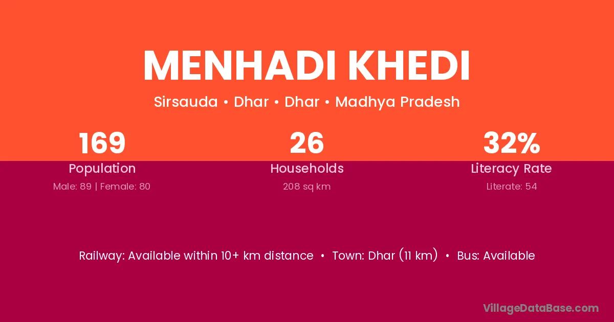 Dhar (11 km) is the nearest town to Menhadi Khedi village for major economic activities and is located approximately 11 km away.