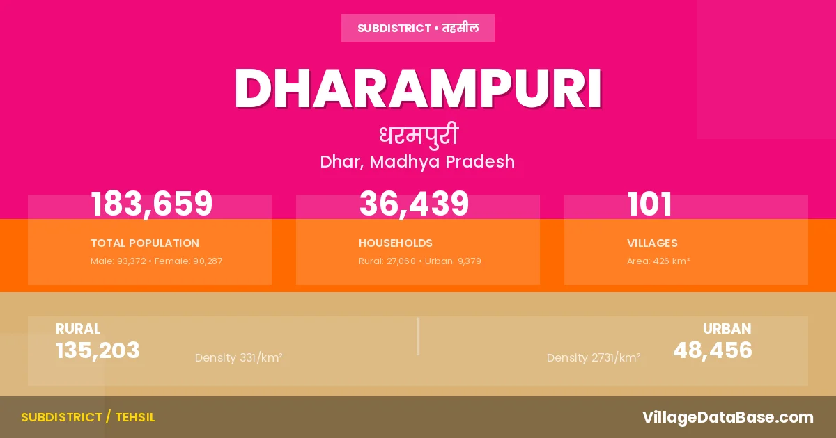 According to the 2011 census The total area of Dharampuri Tehsil is 426 km², with a population of 183659 people. The population density is 431 inhabitants per square kilometre, and there are approximately 36439 houses in the sub district.