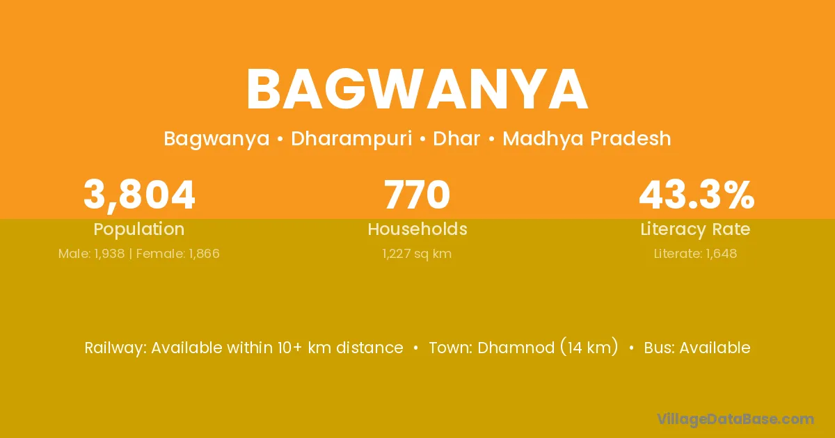 Dhamnod (14 km) is the nearest town to Bagwanya village for major economic activities and is located approximately 14 km away.