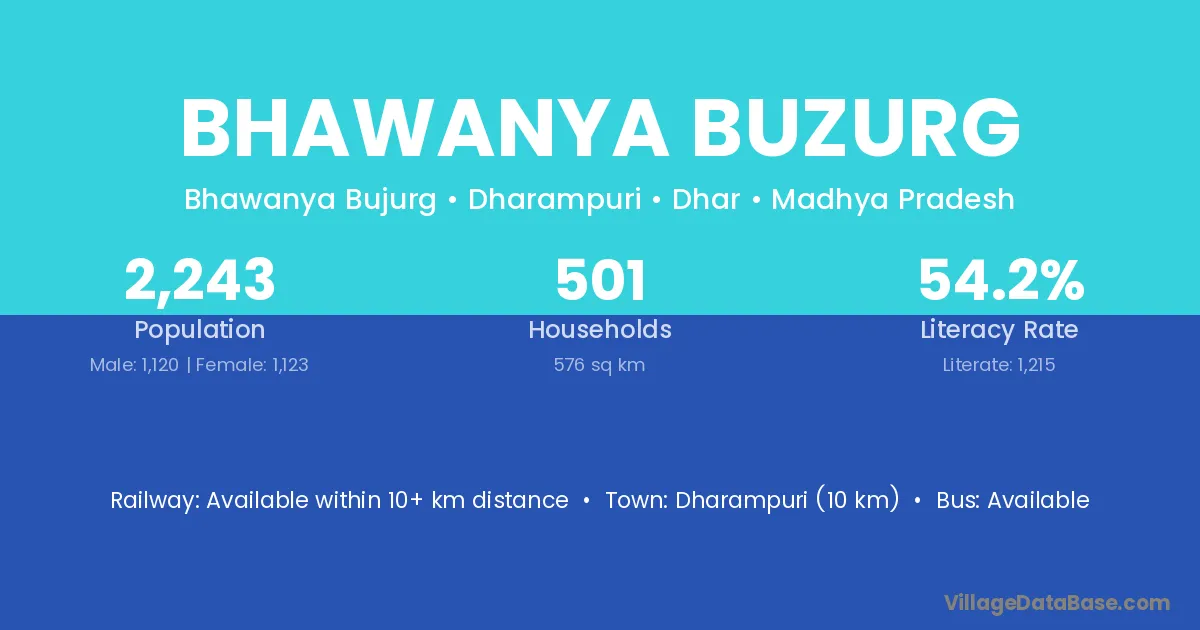 Dharampuri (10 km) is the nearest town to Bhawanya Buzurg village for major economic activities and is located approximately 10 km away.