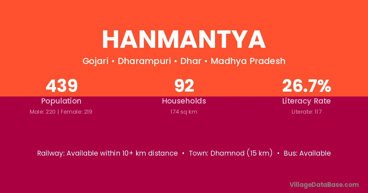 Dhamnod (15 km) is the nearest town to Hanmantya village for major economic activities and is located approximately 15 km away.