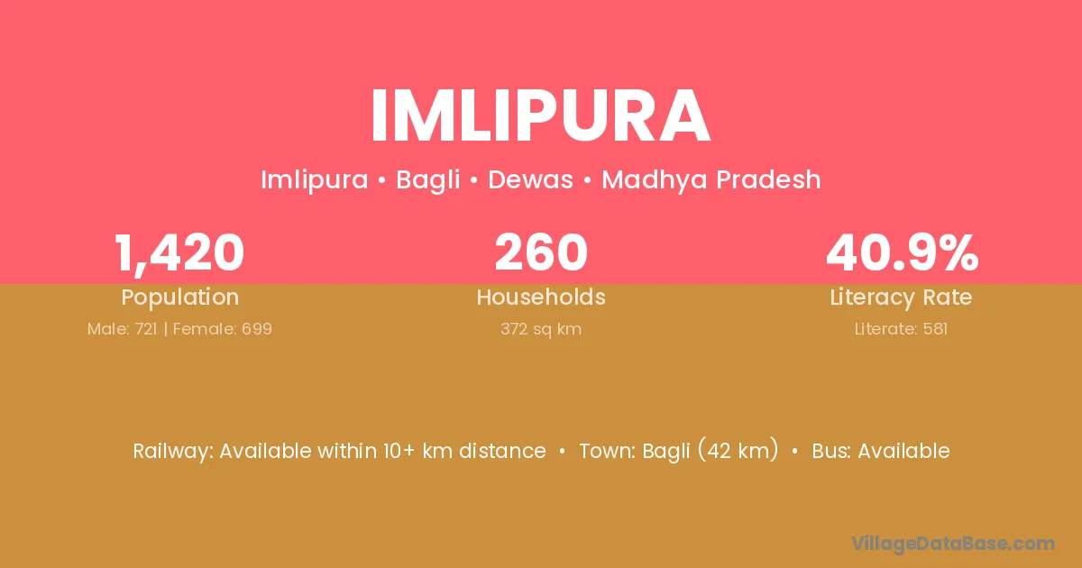The literacy rate of Imlipura village is 48.31%. Male literacy stands at 59.11% and female literacy at 36.76%.