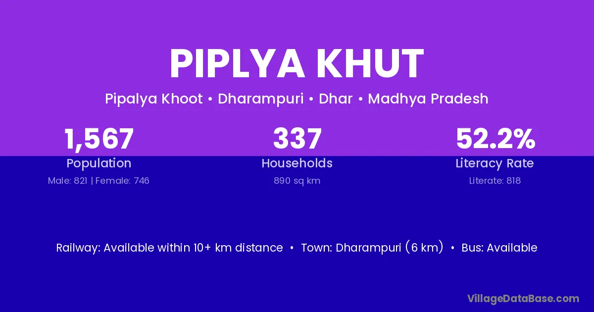 Dharampuri (6 km) is the nearest town to Piplya Khut village for major economic activities and is located approximately 6 km away.