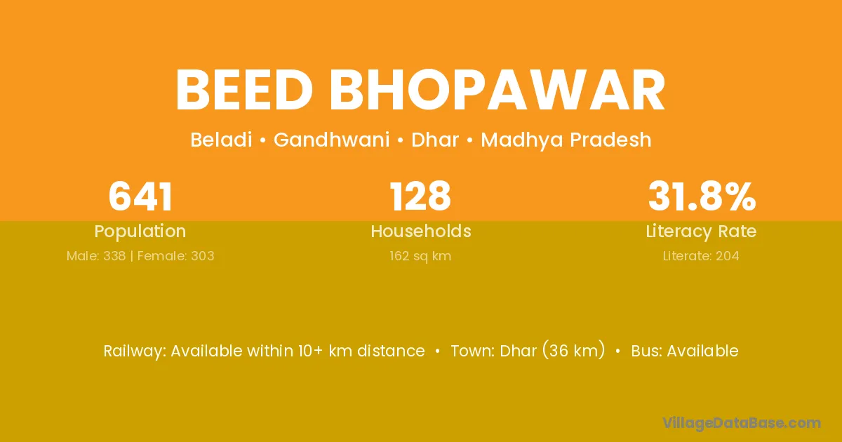 Dhar (36 km) is the nearest town to Beed Bhopawar village for major economic activities and is located approximately 36 km away.