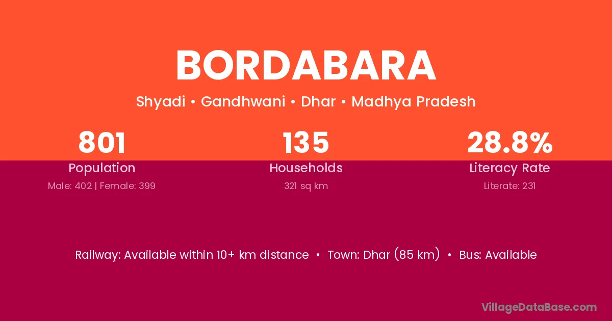 Dhar (85 km) is the nearest town to Bordabara village for major economic activities and is located approximately 85 km away.