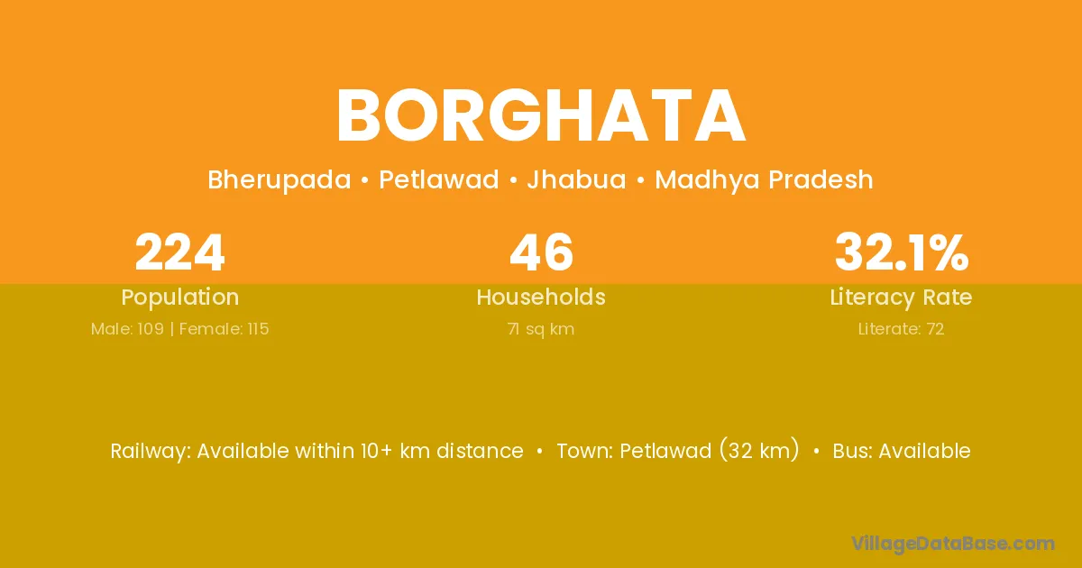 The literacy rate of Borghata village is 38.15%. Male literacy stands at 44.78% and female literacy at 32.40%.