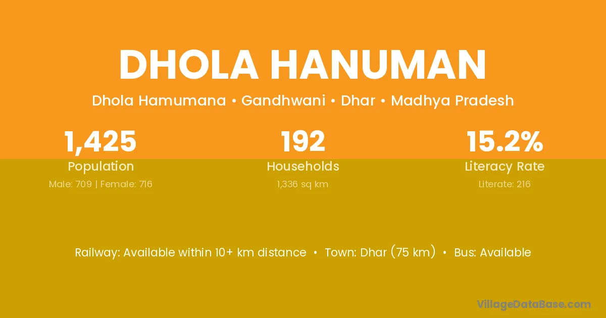 Dhar (75 km) is the nearest town to Dhola Hanuman village for major economic activities and is located approximately 75 km away.