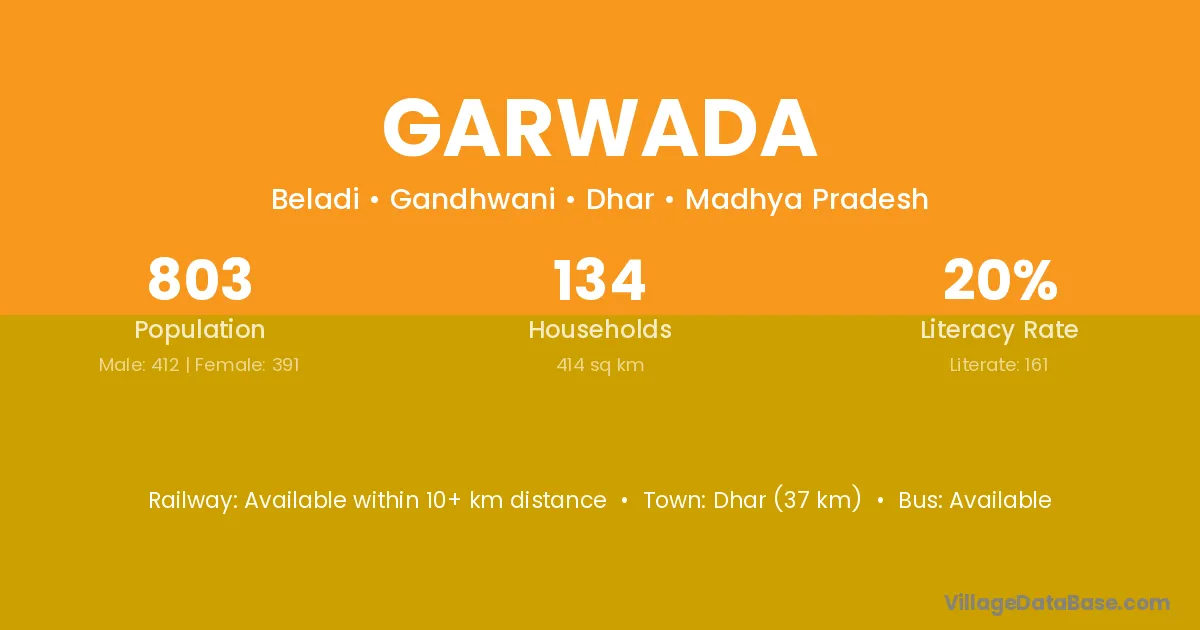 Dhar (37 km) is the nearest town to Garwada village for major economic activities and is located approximately 37 km away.
