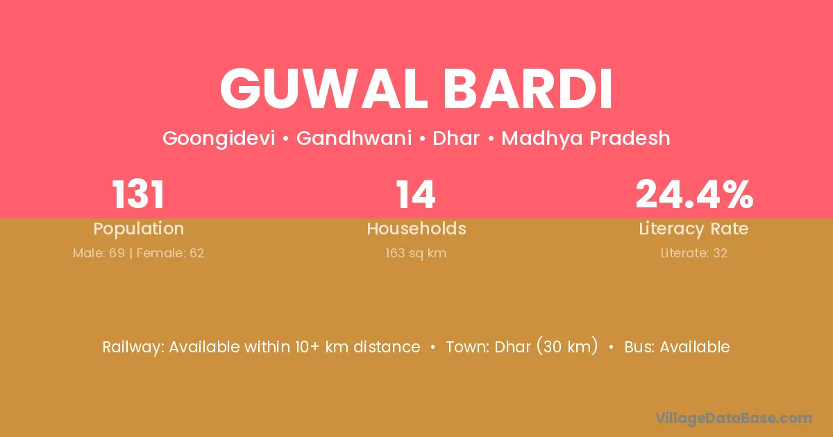 Dhar (30 km) is the nearest town to Guwal Bardi village for major economic activities and is located approximately 30 km away.