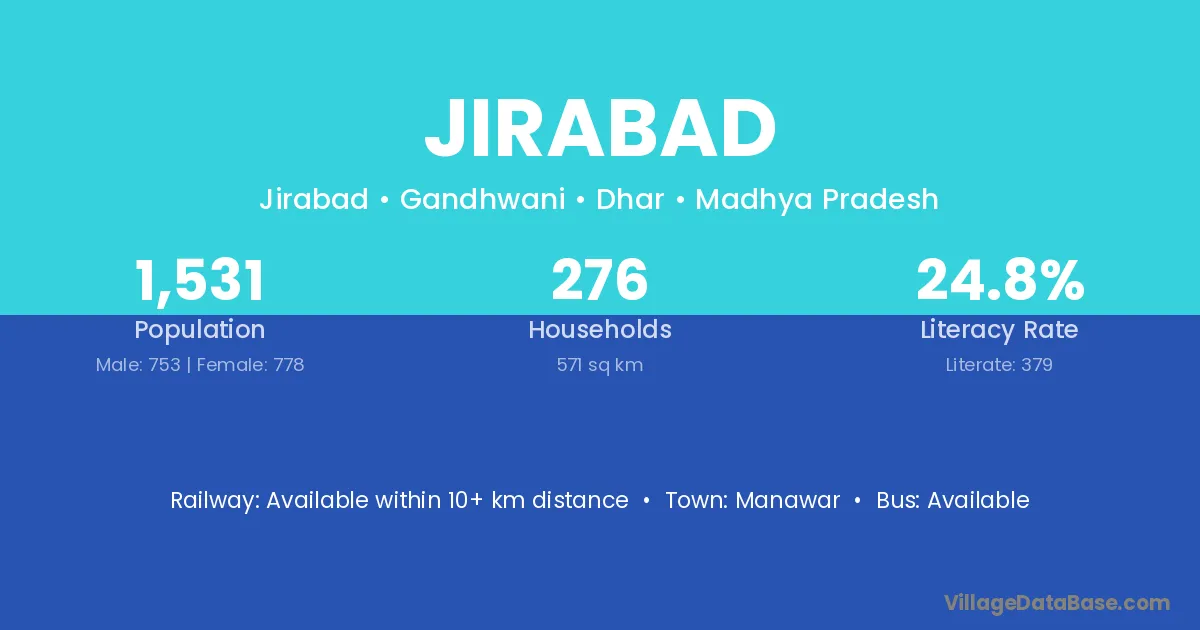 Jirabad village has a total population of 1,531 people, of which 753 are males and 778 are females.