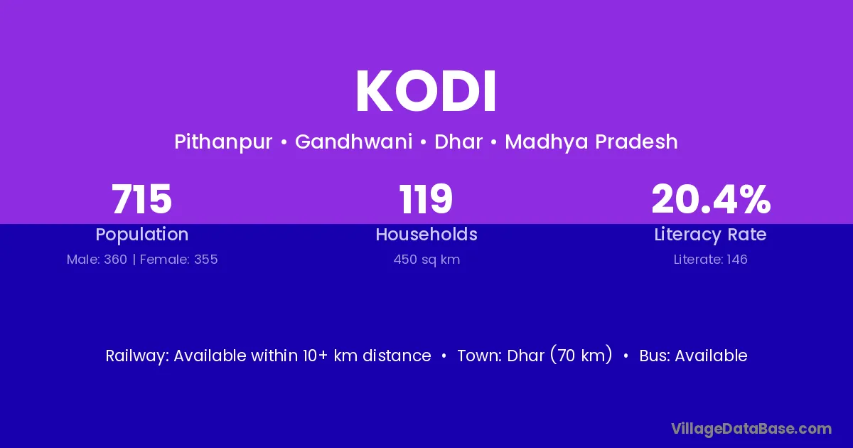 Dhar (70 km) is the nearest town to Kodi village for major economic activities and is located approximately 70 km away.