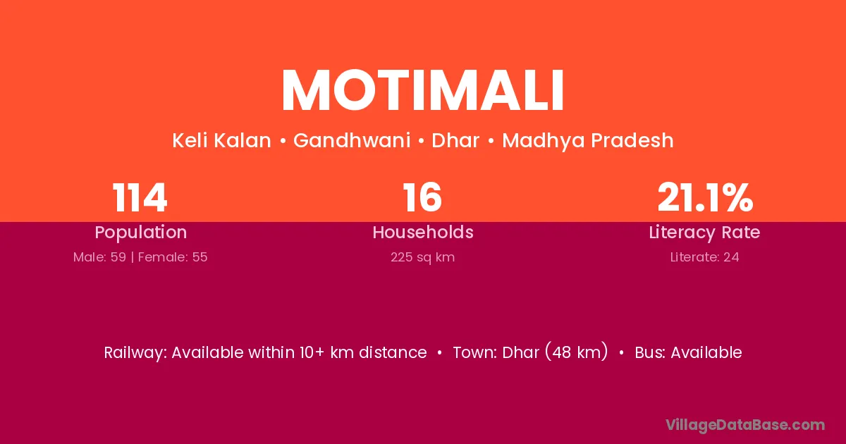 Dhar (48 km) is the nearest town to Motimali village for major economic activities and is located approximately 48 km away.