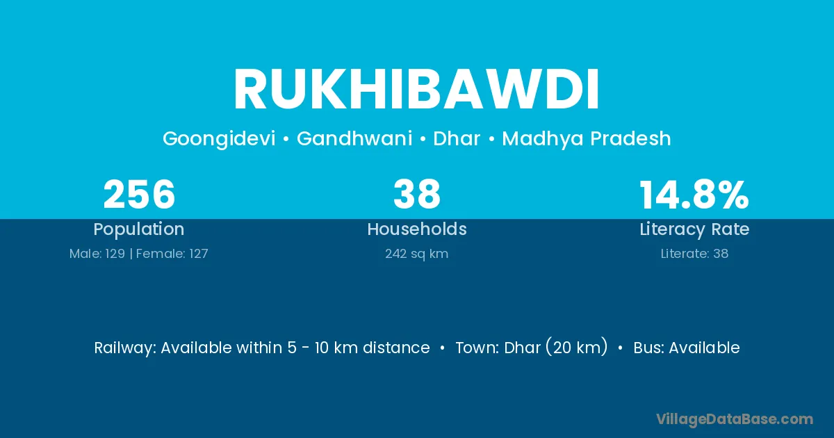 Dhar (20 km) is the nearest town to Rukhibawdi village for major economic activities and is located approximately 20 km away.