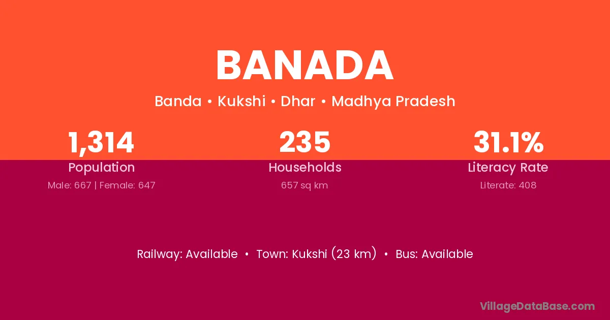 Kukshi (23 km) is the nearest town to Banada village for major economic activities and is located approximately 23 km away.