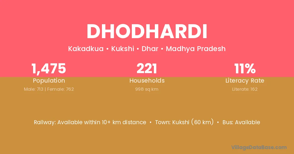 Kukshi (60 km) is the nearest town to Dhodhardi village for major economic activities and is located approximately 60 km away.