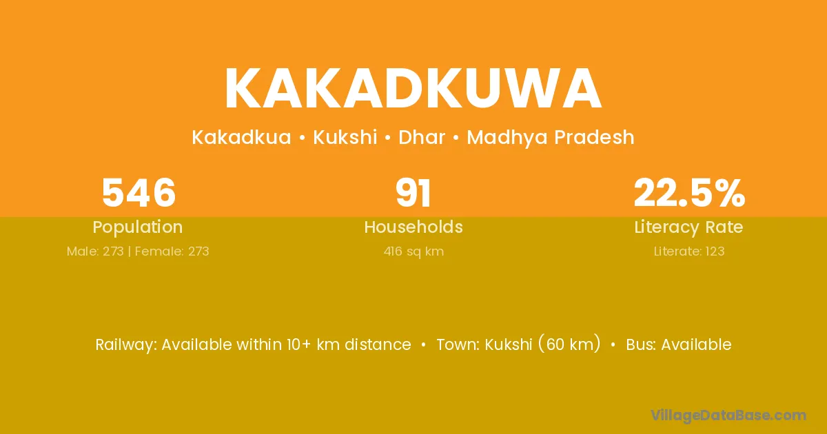Kukshi (60 km) is the nearest town to Kakadkuwa village for major economic activities and is located approximately 60 km away.