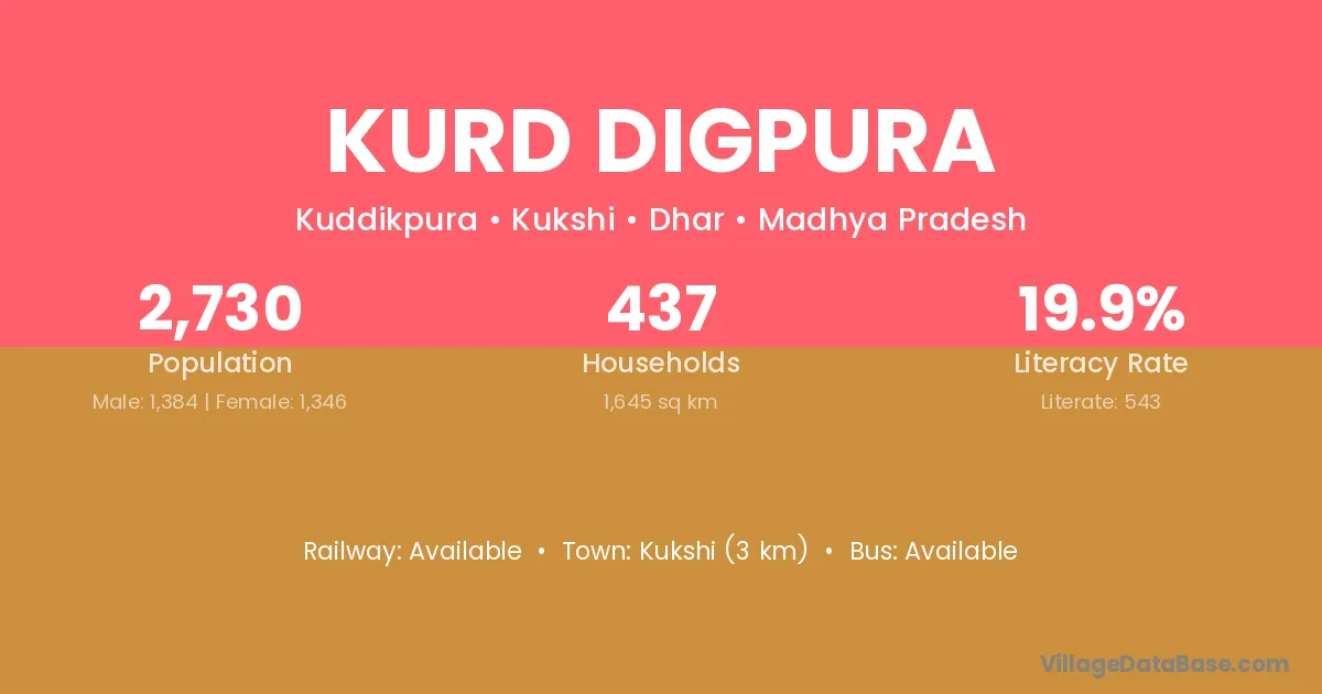 Kukshi (3 km) is the nearest town to Kurd Digpura village for major economic activities and is located approximately 3 km away.