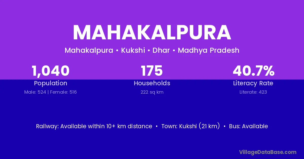 Kukshi (21 km) is the nearest town to Mahakalpura village for major economic activities and is located approximately 21 km away.