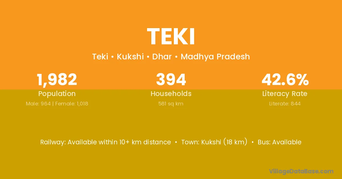 Kukshi (18 km) is the nearest town to Teki village for major economic activities and is located approximately 18 km away.