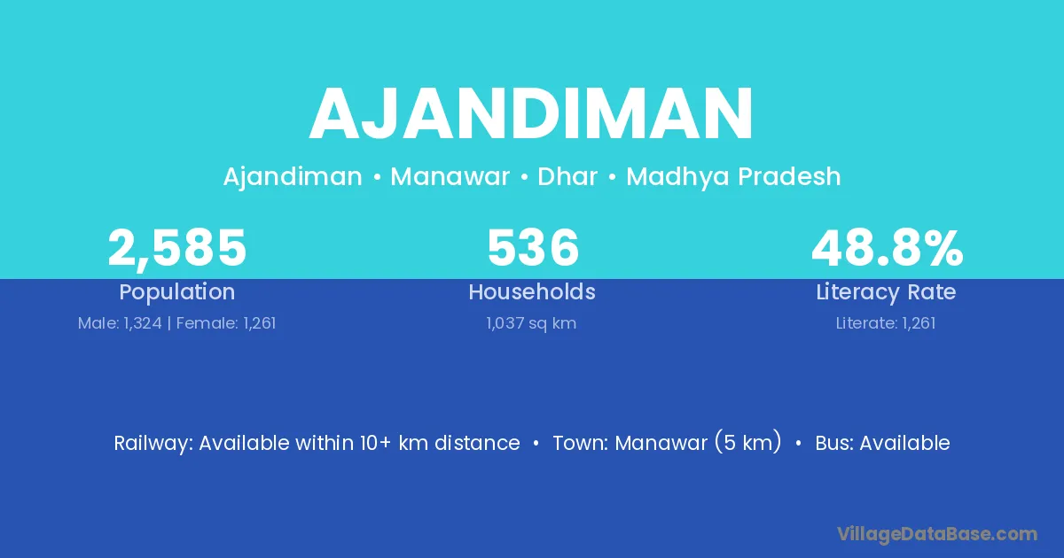 Manawar (5 km) is the nearest town to Ajandiman village for major economic activities and is located approximately 5 km away.