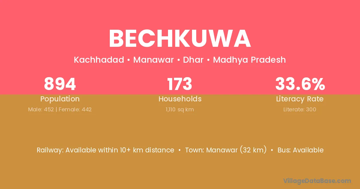 Manawar (32 km) is the nearest town to Bechkuwa village for major economic activities and is located approximately 32 km away.